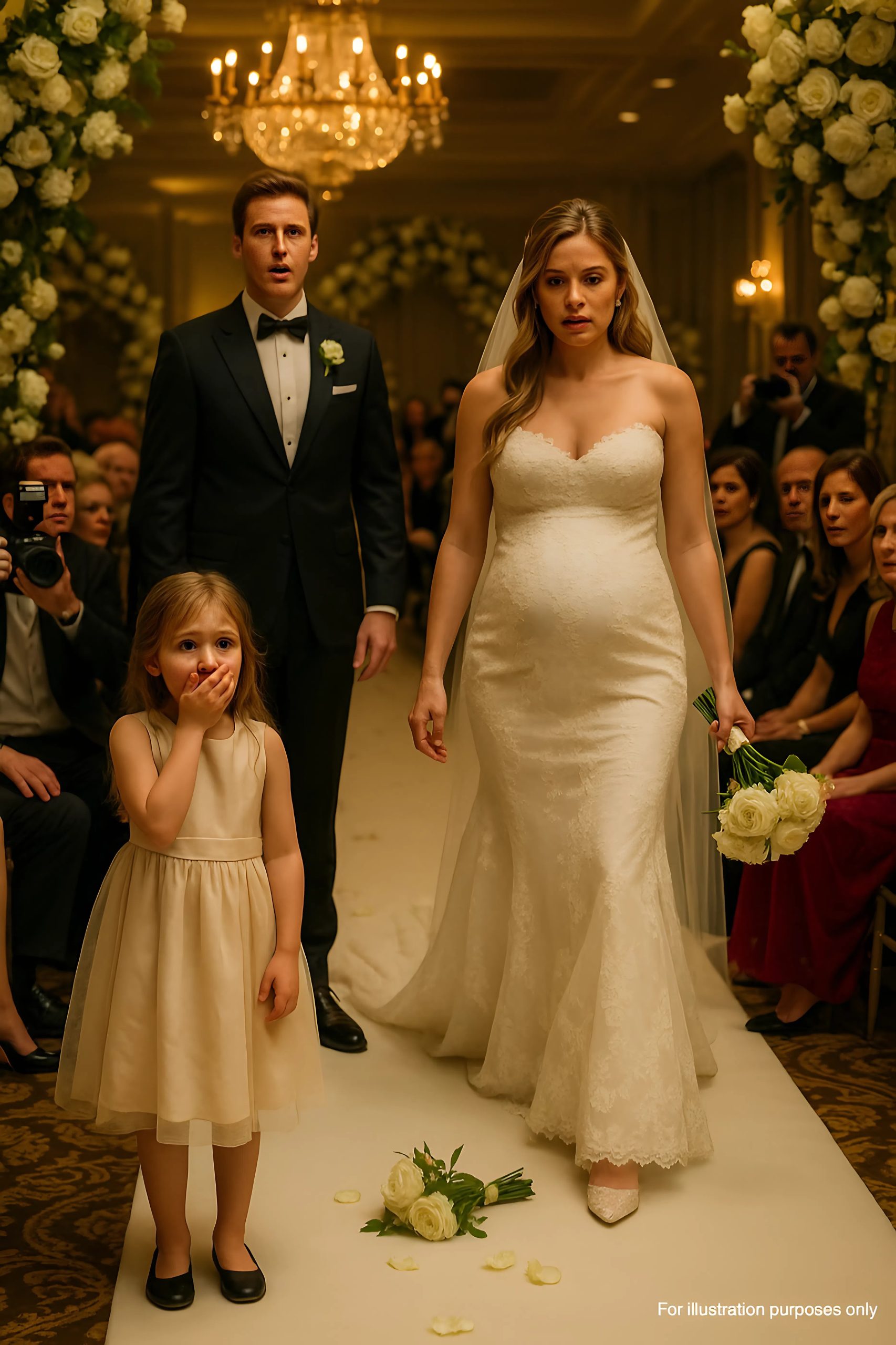 Arany- és elefántcsontszínű rózsák sorakoztak a folyosó mentén, a fejek felett csillárokból álló ragyogó baldachin tündökölt, és a dizájner ruhák és elegáns szmokingok tengere finoman susogott, miközben a vendégek mind megfordultak, hogy megpillantsák a menyasszony érkezését.