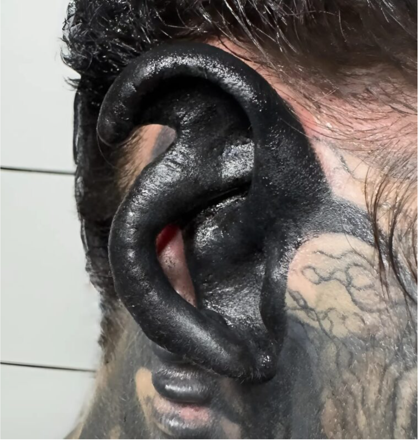 A szemgolyóin is tetoválás van, ezért a sztár külseje meglepő. A nyelvét félbevágták – mintha kígyóé lenne. A bőr alatt implantátumok láthatók, mert Toxy szarvat akart.