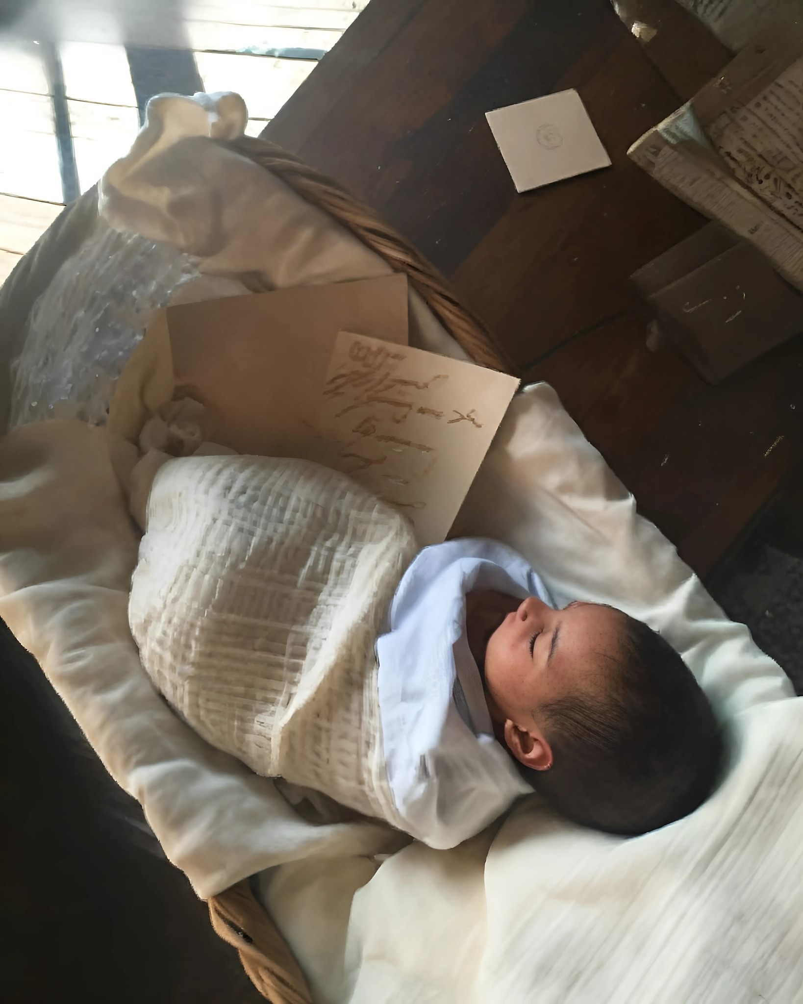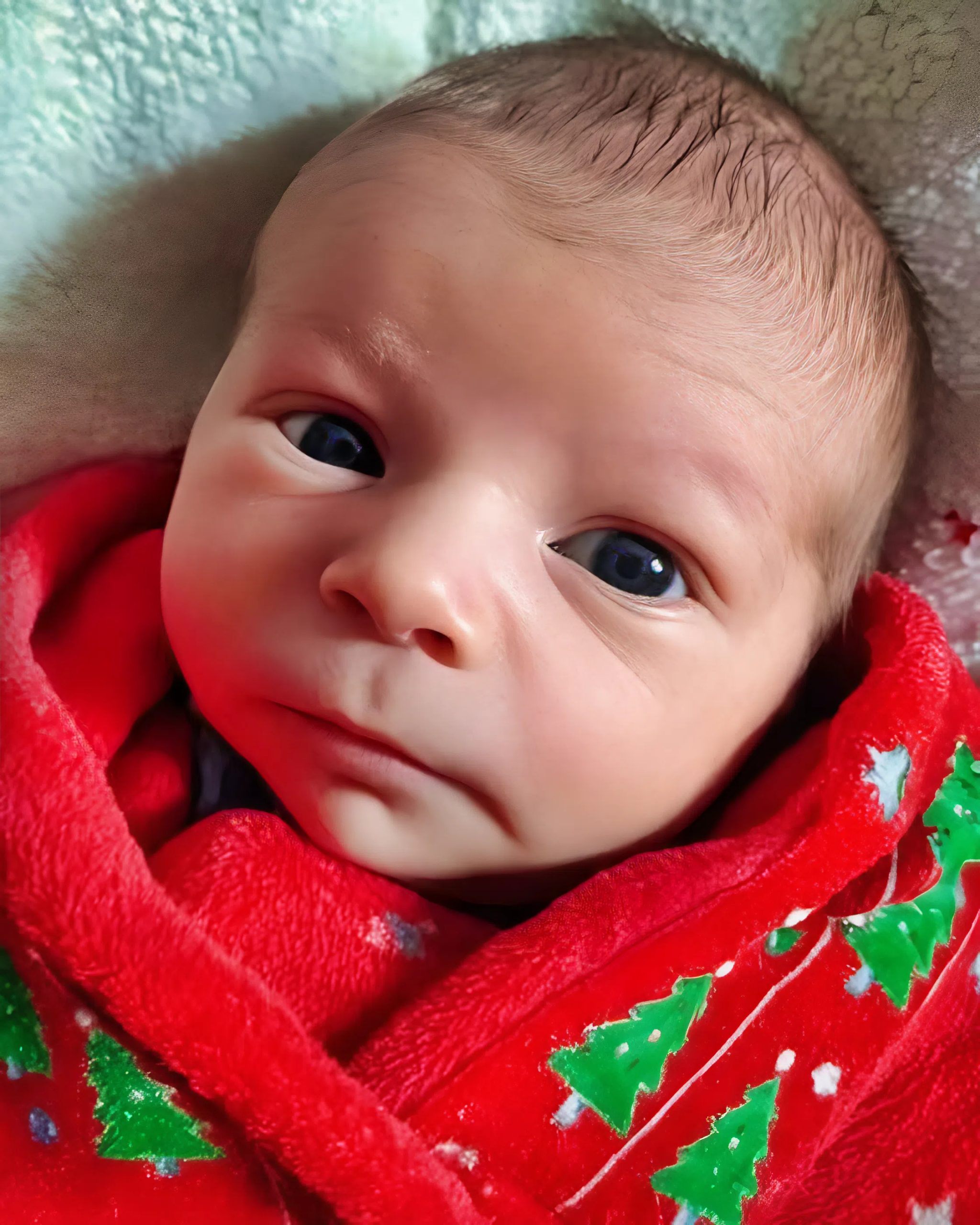 Egy kék takaróba csavart apró újszülöttet szorított a karjába.