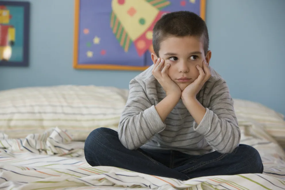 A kisfiú a kanapén ült, és lógatta a lábait.